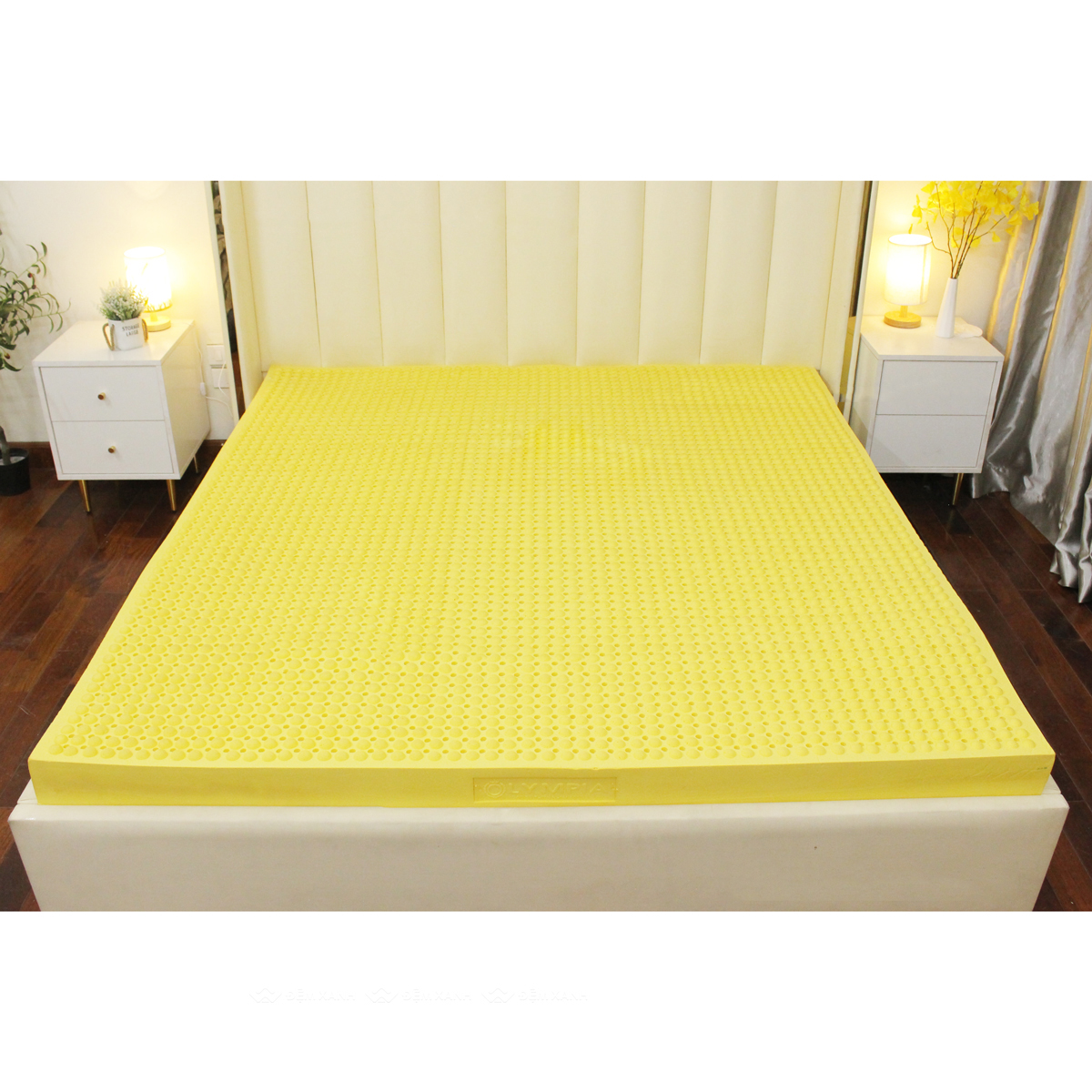 - Mỗi tấm đệm cao su Olympia Aqua massage đều được dập nổi logo Olympia – đệm cao su 100% thiên nhiên ở thành nệm.